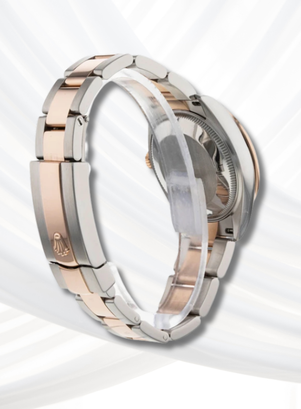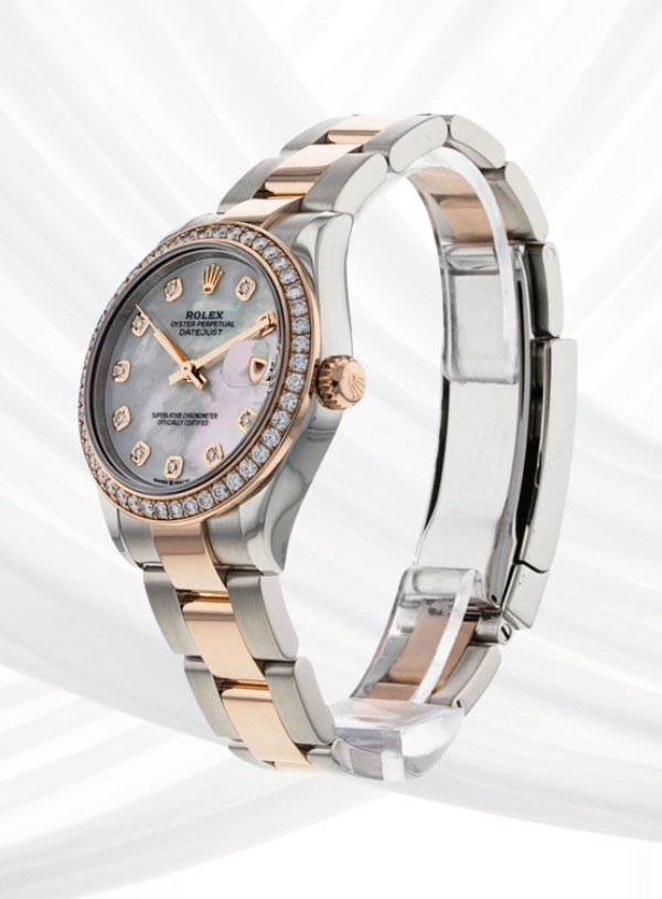 Date Display: At 3 o’clock with magnification lens Bezel: Rose Gold-Tone Bezel with Crystal Accents